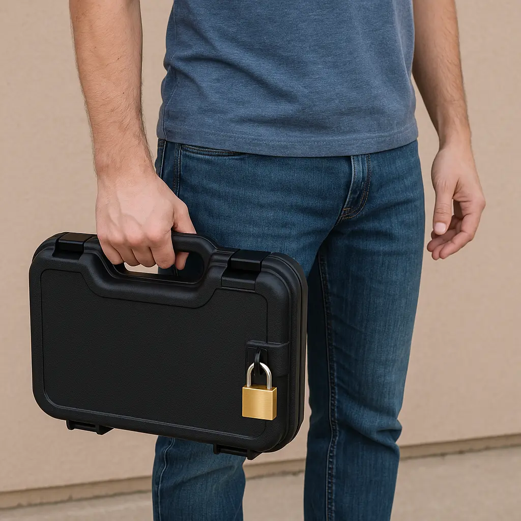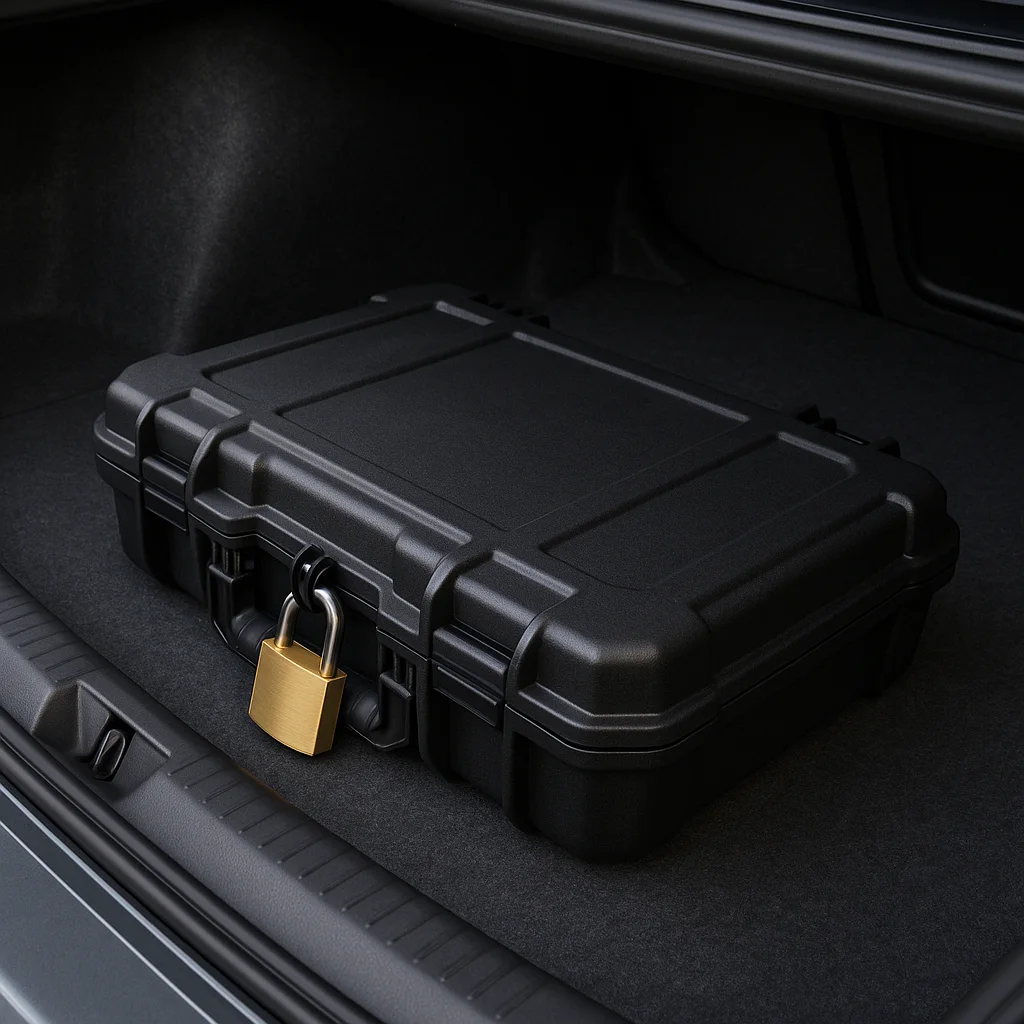 The locked container must be fully enclosed and secured with a lock (padlock, key, or combination).